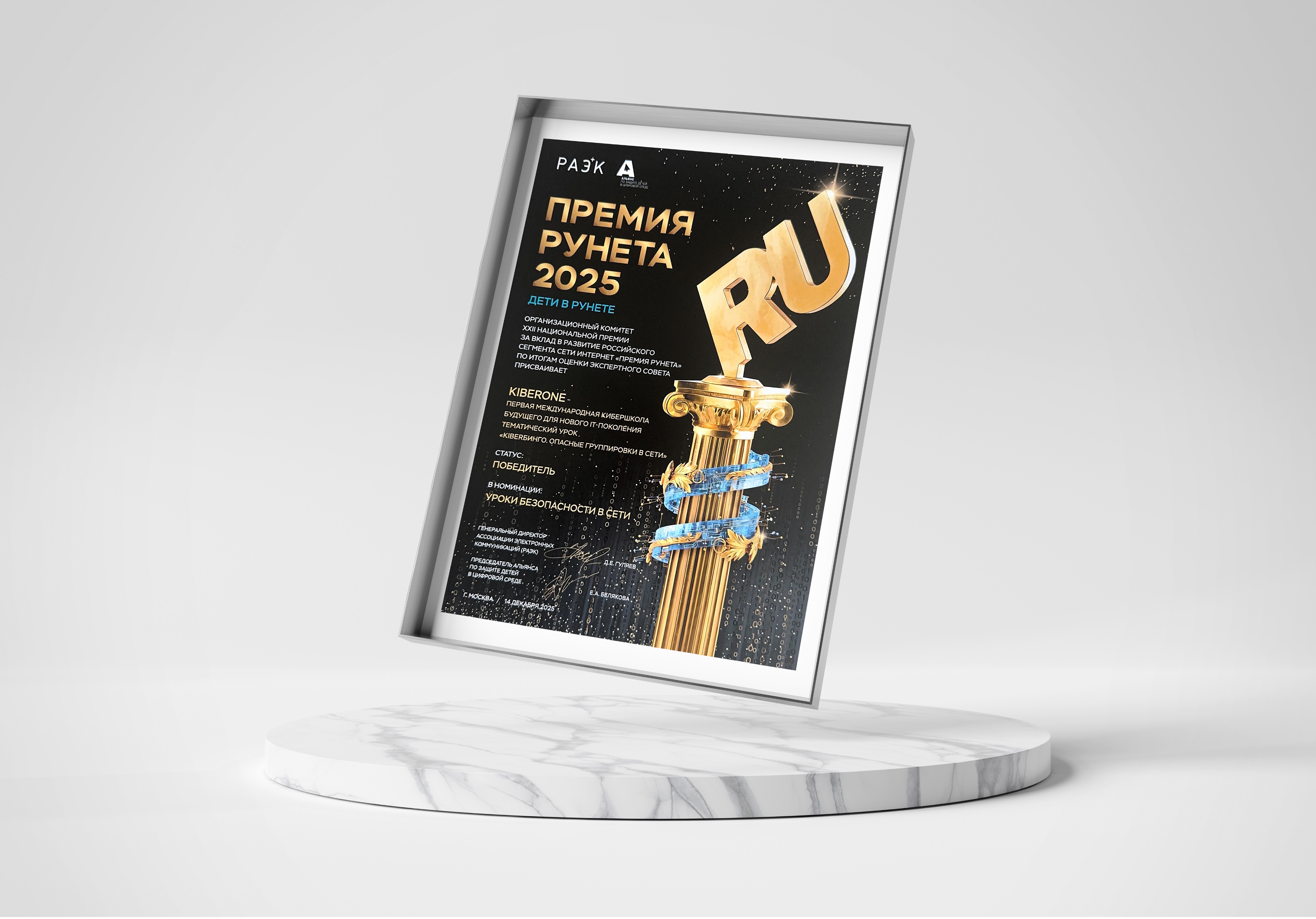 Международная школа цифровых технологий для детей KIBERone стала победителем всероссийского   конкурса «Премия Рунета 2025» в номинации «Уроки безопасности в сети», учрежденной Альянсом по защите детей в цифровой среде.